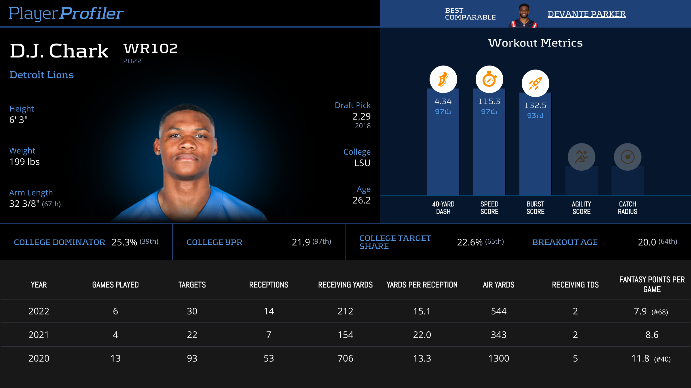 With the Detroit offense humming, D.J. Chark has back-to-back games of at least 90 receiving yards. However, outside of those last two games, he only has one other top-45 fantasy finish this season. Amon-Ra St. Brown is healthy and soaking up targets. Meanwhile, Jameson Williams is ramping up, and Josh Reynolds is also involved in the passing game. These guys are taking opportunities away from Chark.