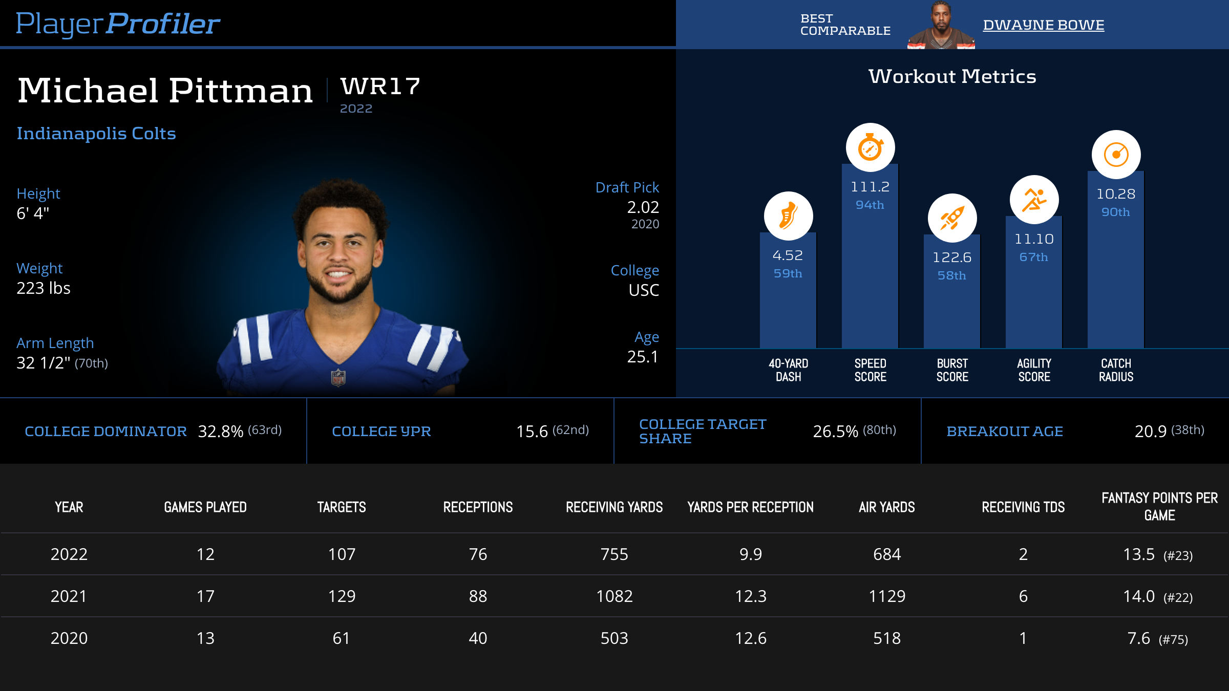 As the Colts’ No. 1 WR, Michael Pittman has four top-24 finishes this season. While the season has not gone smoothly with Matt Ryan, Pittman has 100-percent (No. 1) Route Participation and sees an 8.1 (No. 6) Target Accuracy. The Indianapolis passing attack has not been consistent this season, but this is a week to expect a boom game from Pittman.