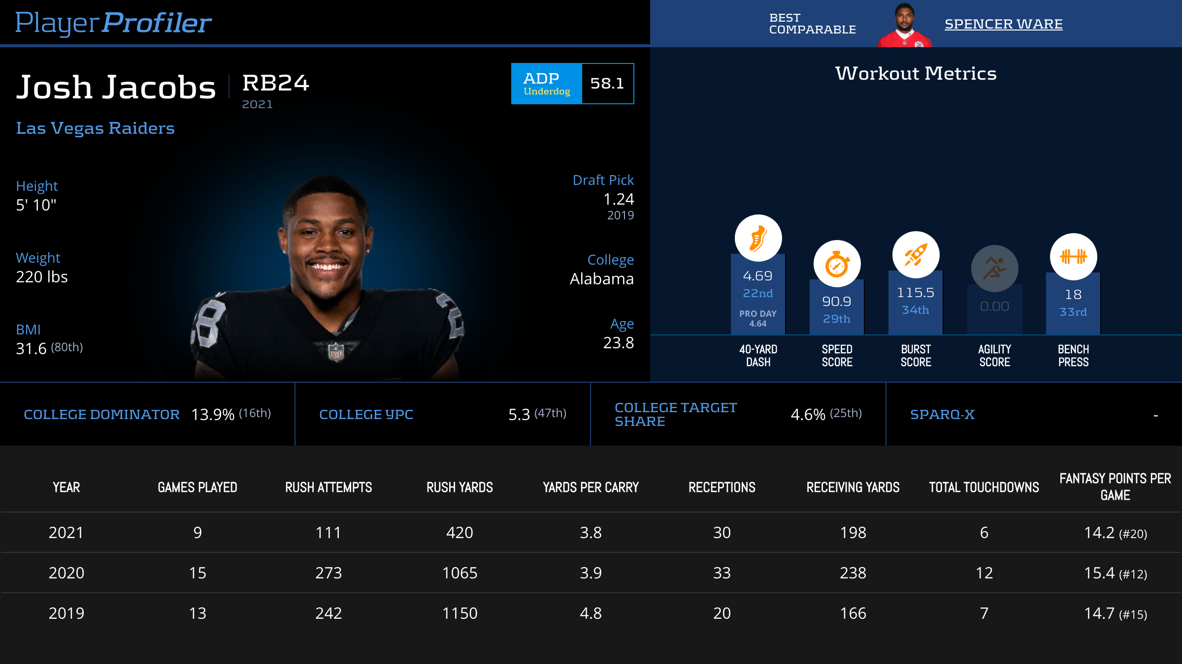 Josh Jacobs is in a similar boat as Antonio Gibson: a running back who has played through various knacks, has never been unleashed as a three-down back, and whose team added a quality running back in the draft. Jacobs has dealt with injuries to his shoulder, knee, and ankle over his first three seasons. Like Gibson, Jacobs only was truly unleashed as a receiver last season once his team’s pass-catching specialist back went down. In the six games Jacobs played without Kenyan Drake, Jacobs garnered 28 targets. In the 10 with Drake, Jacobs hauled in 36. Sound familiar?