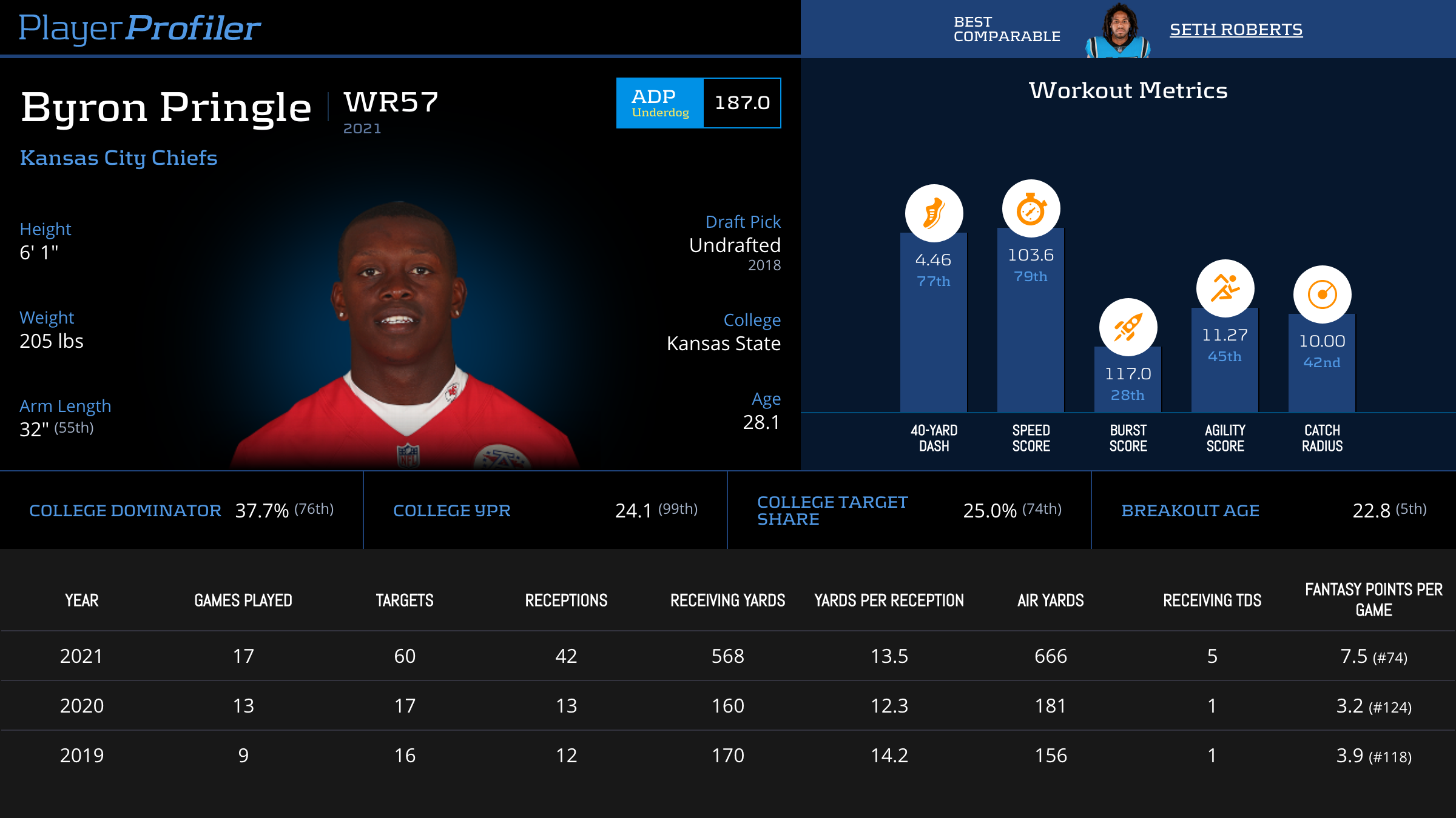 This offseason, many expected Mecole Hardman to take the next step in his career and become an even more reliable option behind Tyreek Hill and Travis Kelce; however, Byron Pringle slowly carved out a place in this offense, running more routes, having a higher Snap Share, and even having more receptions last week against Buffalo.