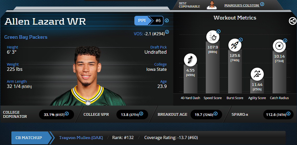 Lazard is sneaky athletic at 6-3, 225-pounds with a 107.9 (88th-percentile) Speed Score. Undrafted receivers can be DFS diamonds in the rough when given opportunity. Especially when priced at the stone-minimum in premium matchups while being tethered to Hall of Fame quarterback.