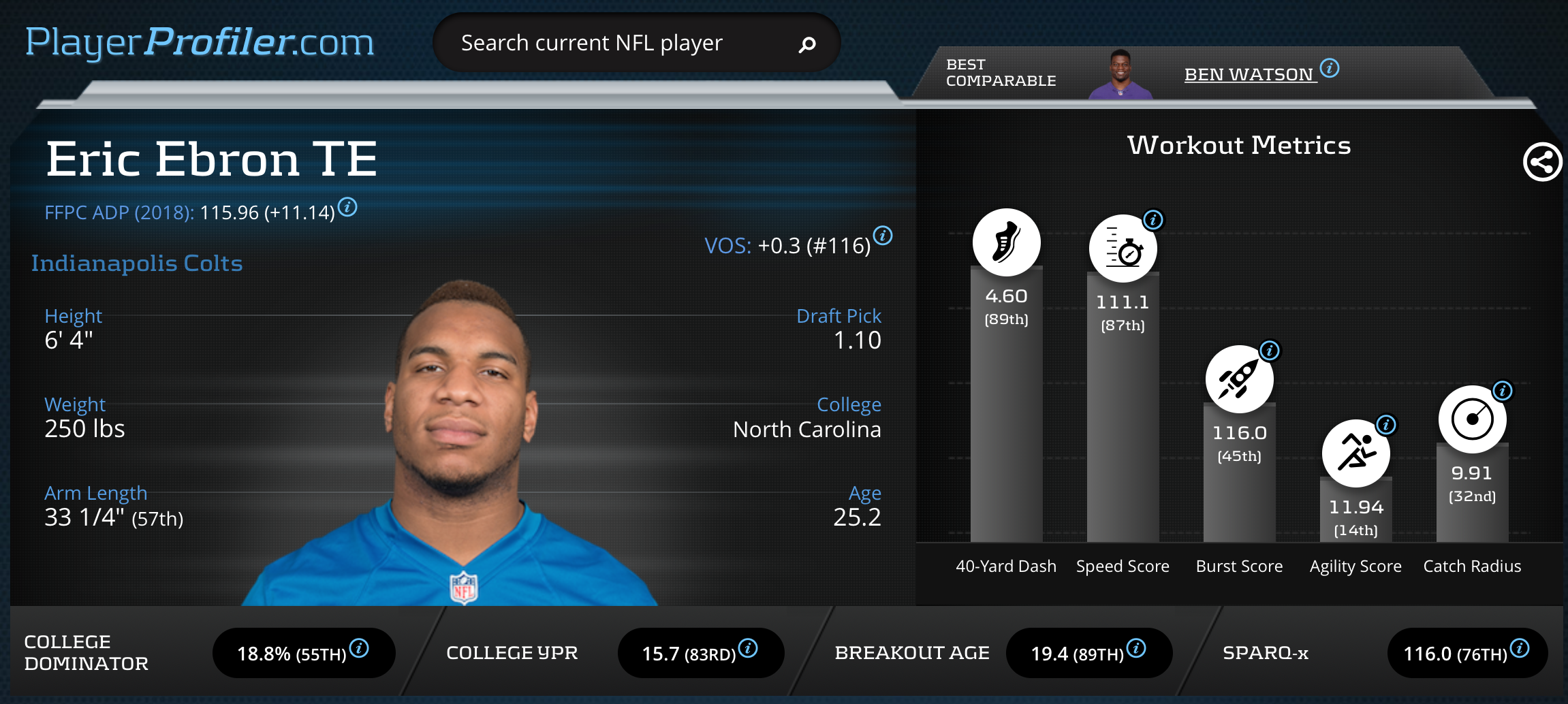 Jack Doyle played just less than 100-percent of the snaps in his 15 active games last season, allowing him to rack up 80 catches, second among tight ends. Doyle excelled at catching the football, hauling in 74.1-percent of his targets last season and catching two-thirds of his contested targets. Doyle should continue to primarily play in-line, as just 16.8-percent of his snaps were from the slot last season. A low-upside athlete, Doyle will continue to play the role of underneath safety-blanket for a quarterback that doesn’t need it. Doyle and Ebron will combine to form one of the most highly-targeted tight end groups in the NFL, something that Andrew Luck has excelled at throughout his career.