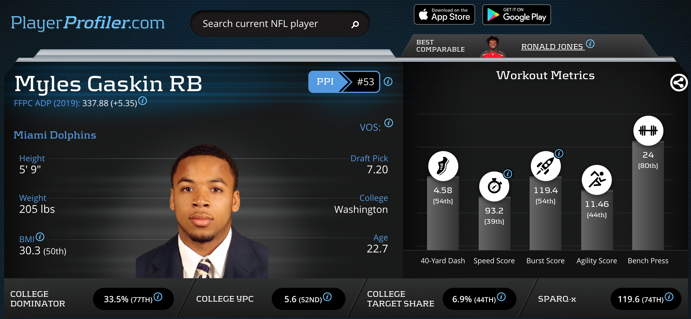 At Washington, Gaskin posted a 33.5 percent (77th-percentile) College Dominator, racking up 5,323 rushing yards and 57 rushing touchdowns throughout his career. He also flashed versatility with 6.9 percent (44th-percentile) College Target Share.