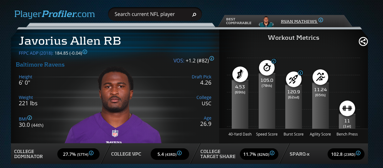 There is no more disrespected running back than RB62 Javorius “Buck” Allen. He is always undrafted yet always finds a way to get on the field and be fantasy-relevant. His only real competition this year is Alex Collins and Kenneth Dixon. Collins is just a few fumbles away from finding his way to the bench and Dixon is just one suspension away from never seeing the field again. Despite that, Collins is being drafted in the fourth round and Dixon, who hasn’t played in two years, is being drafted ahead of Allen.