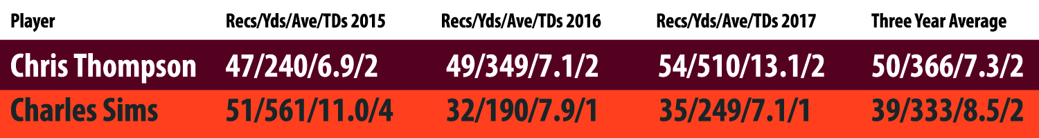 Charles Sims was not even rated when I started writing this article but now has crept up to RB97, meaning he is finally being drafted in at least 5% of leagues. He is the best receiving back on the Tampa Bay Buccaneers. Chris Thompson, by comparison, is currently RB40, but there isn’t much difference in their overall production if we average out their past three seasons: