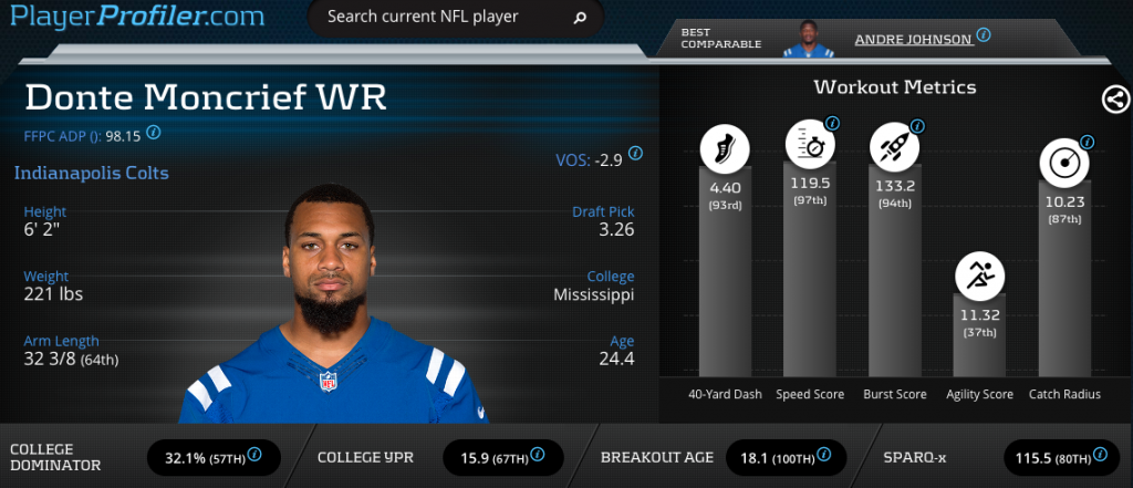 Then there is Donte Moncrief, who has had a lackluster career thus far. Moncrief has never been anywhere close to 1,000 yards and has maxed out at seven touchdowns in his best season. Moncrief posted an 11.32 (38th-percentile) Agility Score and it has limited his upside as a receiver.