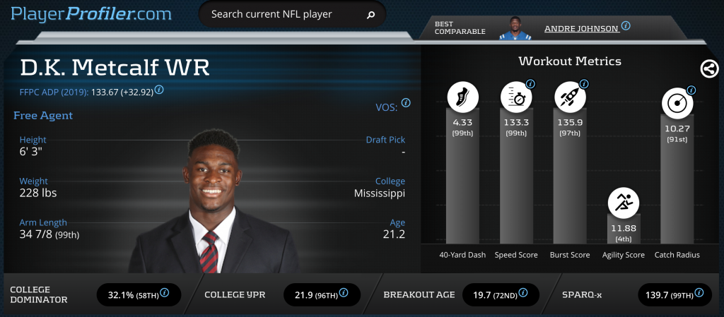 The 2019 NFL Draft is right around the corner and with it comes insanely horrible comparisons insinuating that players who aren’t even drafted yet will be the next Randy Moss or Deion Sanders. While there are a handful of terrible comps to choose from, one player seems to be the only topic of discussion on Twitter these days: D.K. Metcalf. Let’s see who compares closely to Metcalf using the analytics.