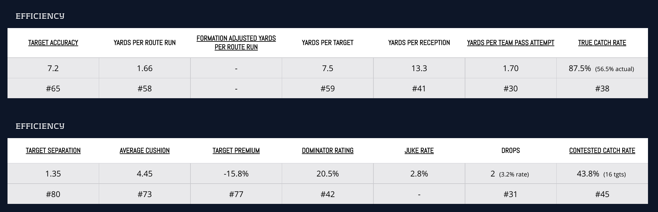 In seven games this year, Smith has hauled in 22 of 33 targets for 168 yards (No. 27) and two touchdowns (No. 11). This equates to 7.3 fantasy points per game (TE21). Still only 24 years old, and an Unrestricted Free Agent this offseason, Smith is likely to look for a new home in 2023. Fantasy managers who believe in Smith’s talent should explore this opportunity to buy at a discount.