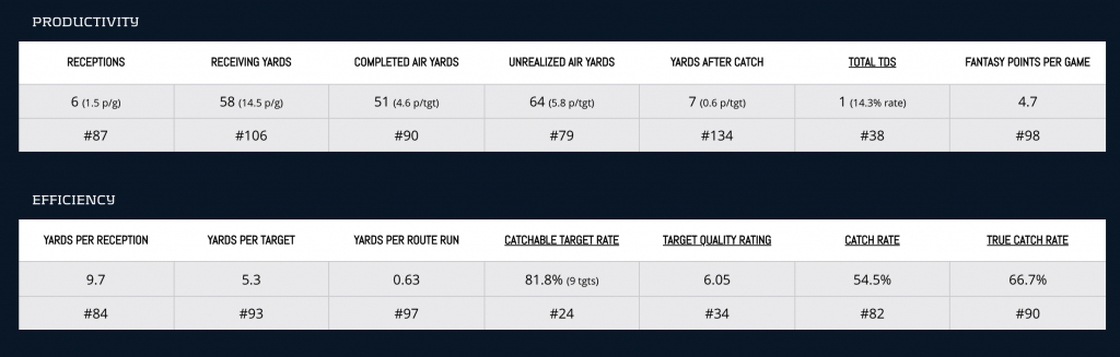 There appeared to be positive signs after Week 3 when Aiyuk caught four of six targets for 37 yards and a TD. However, it all came crashing back down against Seattle. Playing 68.5-percent of snaps in Week 4, he drew three targets ending the game with a single reception for scoreless 15 yards. Kyle Shanahan noted that the second year wideout is “not there yet”, and unfortunately his stock is trending down.