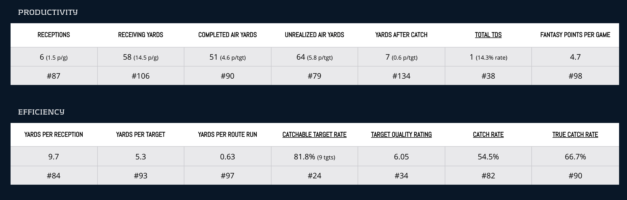 On the season, Gainwell has 19 carries and earned 18 targets, compared to Sanders’ 37 and 14, respectively. While the two are equal in terms of True Yards Per Carry (4.4), Gainwell has been the more efficient back. He leads his teammate in metrics such as Evaded Tackles (7 to 4), Juke Rate (21.9 to 8.3-percent), and Yards Per Touch (6.2 to 5.7). Gainwell accrues 14.29 Lifetime Value points to jump eight spots to RB28. On the other hand, Sanders loses three spots to slip to RB20.
