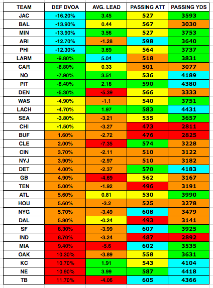 The “bad defense” narrative tells us that playing from behind is a source of passing volume. Bad defenses allow points, that puts the team behind, and the team switches to a pass-heavy approach. But, the narrative overlooks efficiency. Take for example the Rams, who played last year with, on average, a five point lead. Despite a lack of passing attempts, they were one of the more efficient passing offenses in the league, gathering upwards of 3800 yds (7.39 yards per attempt). The counter-example is the Cleveland Browns who, despite throwing the ball nearly 600 times were unable to top 4,000 yards (5.6 yards per attempt). The two most efficient passing teams were the Saints and the Chiefs. Both were in the bottom half of the league in pass attempts yet top seven in passing yards. On average, both teams were playing with a lead. In the passing game, efficiency outweighs volume.