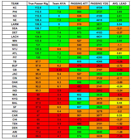 At the top of the chart are the teams whose QBs held the highest True Passer Ratings with Adjusted Yards Per Attempt (AY/A) closely aligned. Total Attempts, however, do not follow. A number of low-attempt teams moved the ball efficiently and compiled more yards. Other high attempt teams had poor efficiency. Despite the volume of pass attempts, no team with a True Passer Rating below Jameis Winston’s 97.7 topped the 4,000 yard mark.