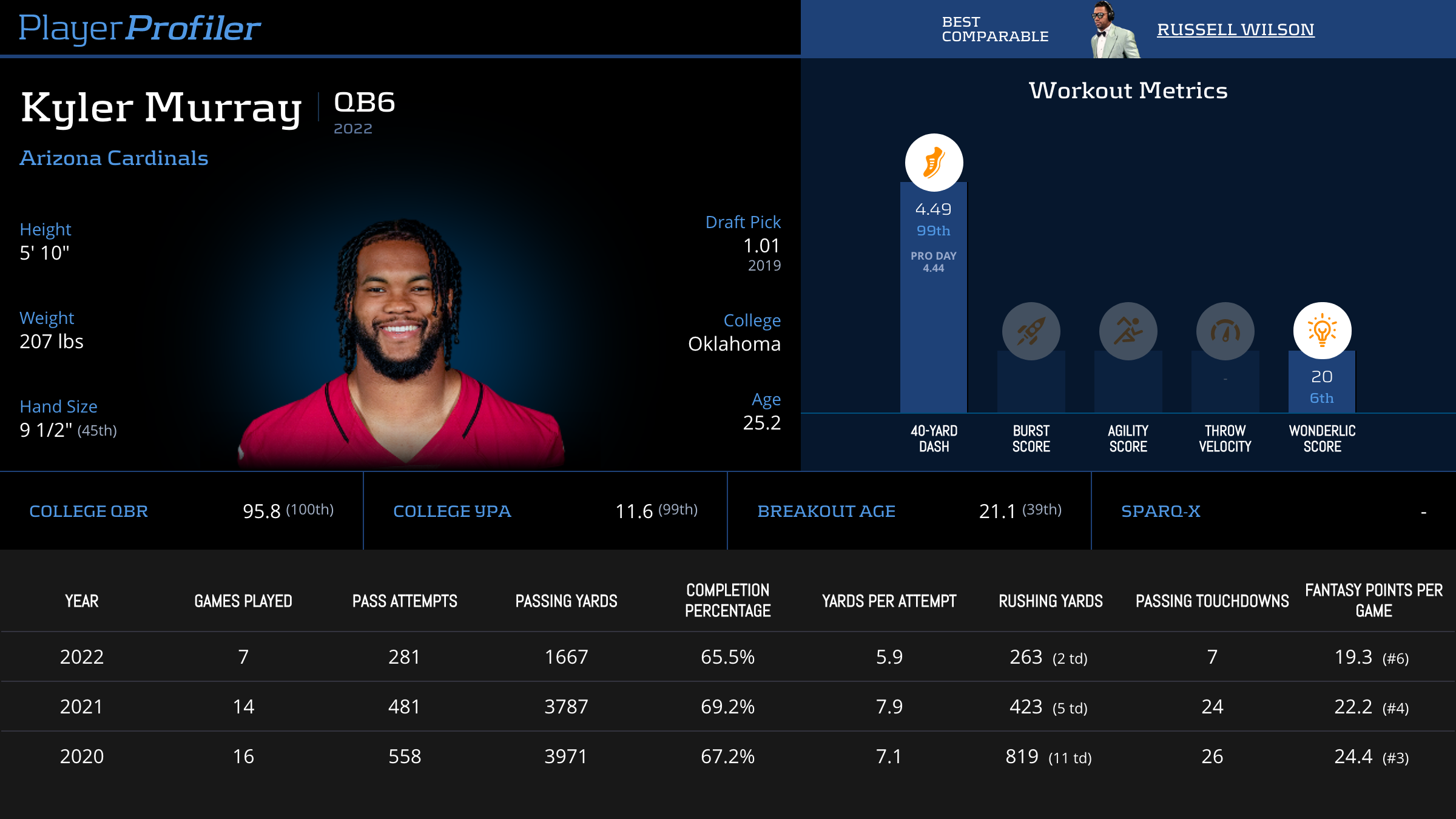 Just a couple of months ago Kyler Murray was drafted as the sixth quarterback off the draft board. Fantasy managers’ frustrations are growing due to his scoring less than 20 points in four of his last five games. Murray hasn’t finished as a top-five quarterback in 2022 and hasn’t been a top-10 QB since Week 4. Chances to buy into a player isn’t always about hidden metrics. Sometimes opportunities to buy can come from a fantasy manager’s perspective. This is one of those moments because eight weeks in, and Murray is the QB 6 on the season.