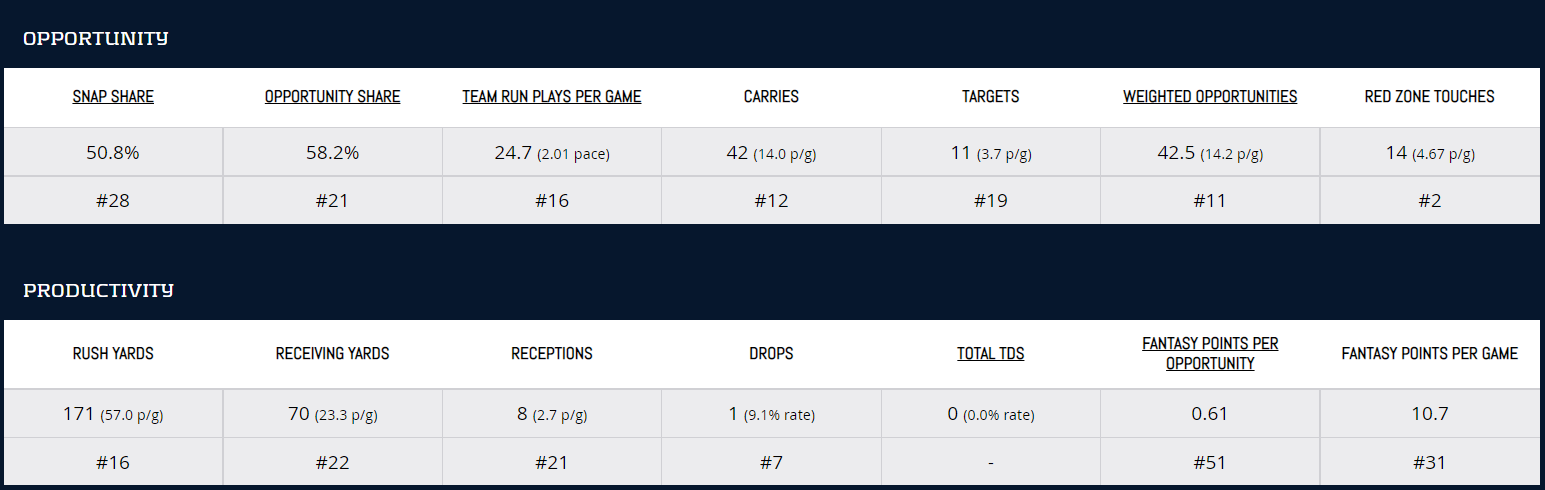 Ezekiel Elliott had a bounce-back after the fantasy community was ready to write him off for Tony Pollard. Suddenly, he is No. 8 in Carries Inside The 10-Yard Line per game, yet less expensive than other options such as Aaron Jones and Nick Chubb, players that are averaging close to what Elliott is now averaging inside the 10-yard line. Dallas is facing Carolina, the No. 1 rush defense so far allowing 45 rushing yards per game. Additionally, he is No. 22 with a 57.3-percent Opportunity Share. This week, Elliott is a player to have in your pool for tournaments for touchdown upside, but is not the safest play for cash games.