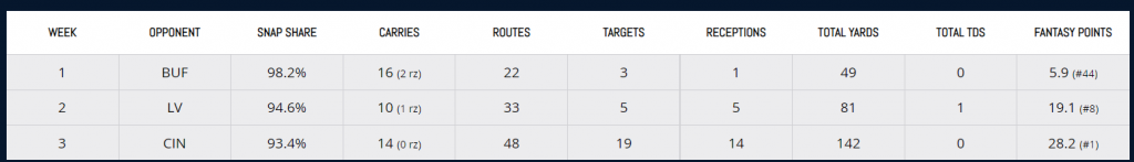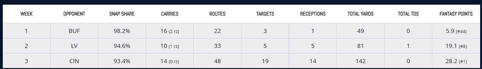 Jonathan Taylor continues to be a great bargain because he has not scored a touchdown yet this year. The lack of touchdown scoring is keeping his fantasy points low and his price low. He only has one target inside the 10-yard line all year, however, he is No. 2 behind Derrick Henry in carries inside the 10-yard line and comes heavily discounted from Henry. Provided he is healthy, he is bound to score touchdowns and has the upside to have a two or three-touchdown performance. Miami has the No. 27 rush defense allowing 136 rushing yards per game. Week 4 could be the week that Taylor hits his upside.