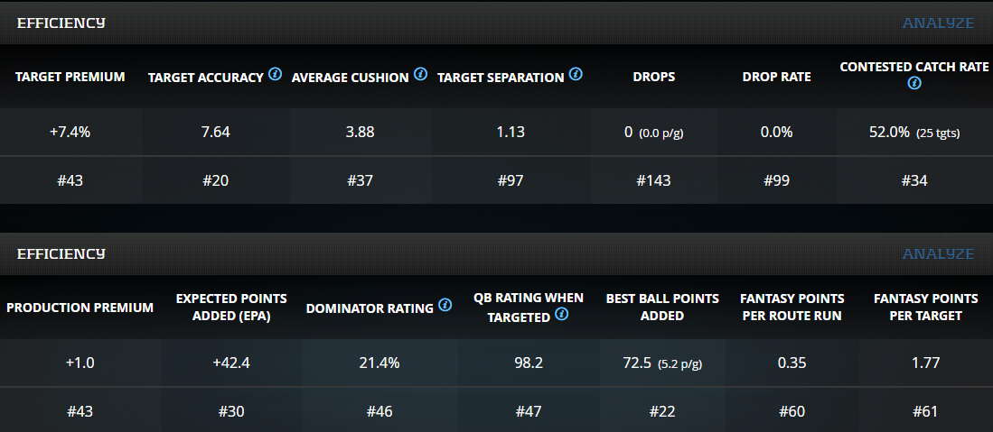 Put into context, Smith’s 36th-percentile College Dominator Rating rating may actually be a positive indicator. He was playing alongside two future first-round receivers and two more receivers who may go in the first round of the 2021 NFL Draft. At tight end, Smith accounted for 14-percent of the receiving volume on a team with four potential first-round players. Unsurprisingly, he made up for decreased volume with incredible efficiency. Smith’s 16.1 yards per reception in his junior season ranks in the 86th-percentile among qualified tight ends. He then went out and ran a 4.63 (87th-percentile) 40-yard Dash. At 6-2 and 242-pounds, that gives him a 102.0 (71st-percentile) Speed Score. Smith has the athleticism and efficiency history to make the most of a solid role this week. He remains the best streaming option if available and a sneaky upside play at tight end.