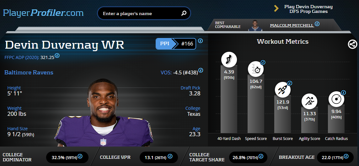 Duvernay posted an above-average 32.5-percent (59th-percentile among qualified wide receivers) College Dominator Rating to go along with his 4.39 (95th-percentile) 40-yard Dash time and 121.9 (53rd-percentile) Burst Score. For teams dealing with injuries in the fantasy semifinals, Duvernay is among the best pickups of the week and is worth a desperation start.