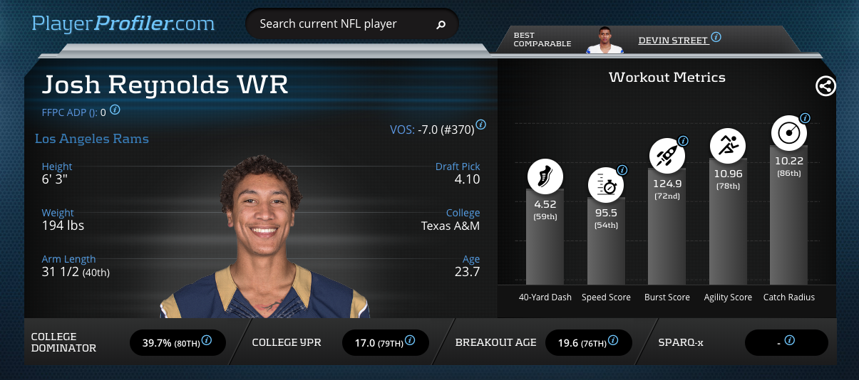 Reynolds sports a 100-percent (3-for-3) red zone catch rate this season and his build backs up his play in that area of the field. At 6-3, 194-pounds with a Catch Radius that ranks in the 87th-percentile, he offers Jared Goff an outstanding go-up-and-get-it guy. Reynolds earns a College Dominator Rating in the 80th-percentile, evidenced by his 12 TDs and 1,039 receiving yards on 61 targets in his final season at Texas A&M.