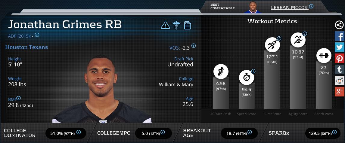 According to Matthew Freedman, Jonathan Grimes senior year nQBDR (“precursor to Workhorse, which will probably be similar”) was 80.45 (“very solid”) and had a tantalizing market share as a receiver. Grimes’ 51-percent dominator rating was good enough to rank in the 97th-percentile, supports Matthews’ findings. We know that receiving backs, especially for those in a timeshare, are an important factor when taking the antifragile approach to drafting your fantasy team. I don’t think anyone is really expecting a Brian Hoyer–Ryan Mallett led Houston team to be a scoring machine. Houston will probably be trailing a lot unless their defense keeps them in games (never doubt Watt). Check downs to the running back are coming.