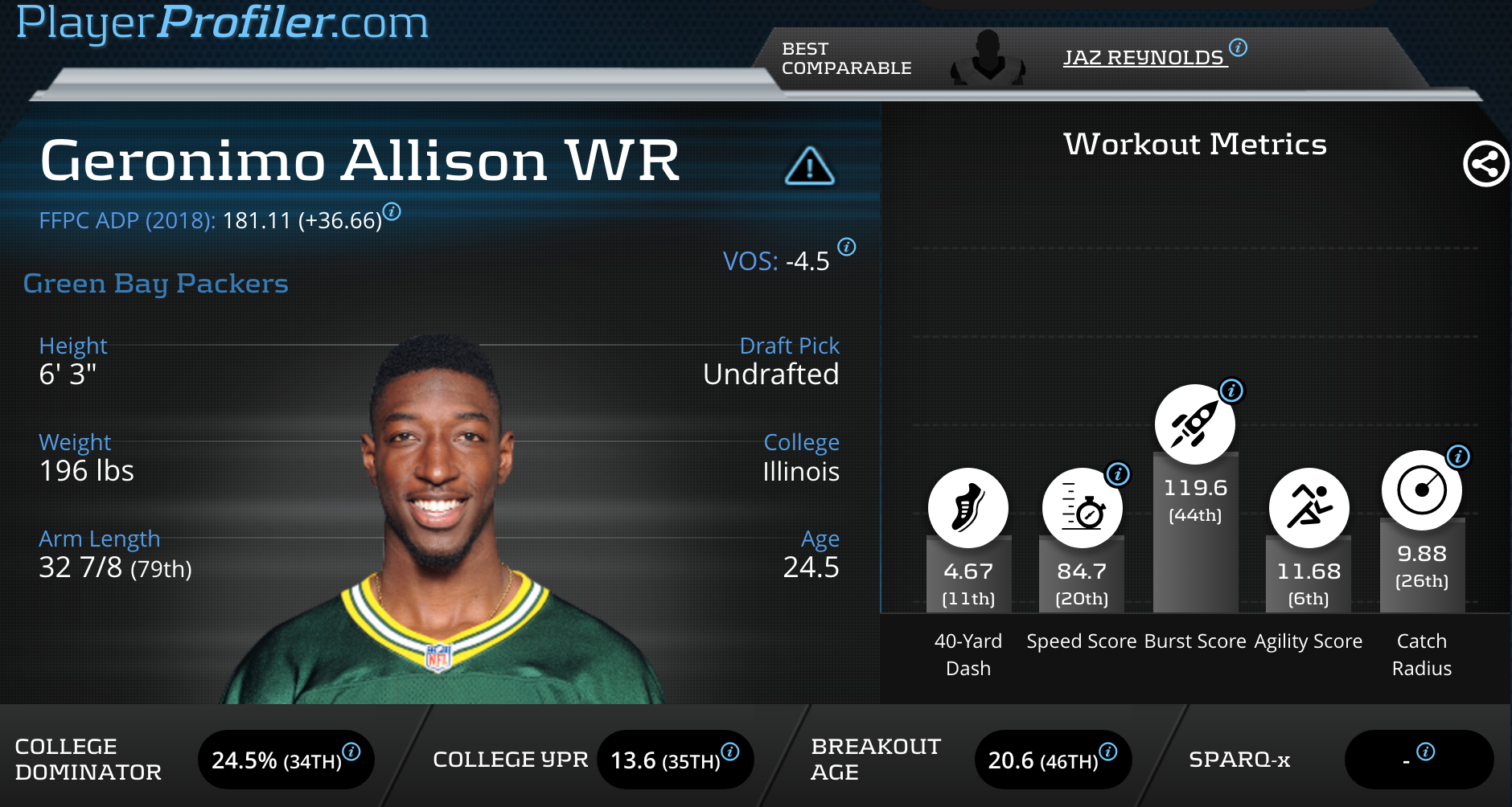 Allison’s competition for the third receiving spot includes rookies J’Mon Moore, Marquez Valdes-Scantling and Equanimeous St. Brown. All three players’ workout metrics indicate they obviously are more athletic than Allison. However, for wide receivers, breakout age gives insight into how a player will translate into the NFL, especially in the early years. In February, Eric Lindberg dove into the implication of breakout age and predictability of success for wide receivers in the NFL. Valdes-Scantling posted a 22.9 (4th-percentile) Breakout Age. Receivers with a low breakout age tend to struggle in the NFL. Dede Westbrook and Kelvin Benjamin are the most fantasy relevant players with similar breakout ages. However, these wide receivers had better College Dominator Ratings. Westbrook posted a 38.2-percent (76th-percentile) College Dominator and Benjamin had a 29.3-percent (49th-percentile) rating. The numbers indicate that Valdes-Scantling will have a difficult time being fantasy relevant. Equanimeous St. Brown, meanwhile, posted a 112.1 (93rd-percentile) Speed Score. At 6-5 and 214-pounds, St. Brown is a big, fast wide receiver. J’Mon Moore has a phenomenal 10.60 (98th-percentile) Agility Score. Moore also has an impressive 10.38 (97th-percentile) Catch Radius. Both of theses players have more impressive athletic profiles than Allison, but the Packers have a history of disregarding athleticism.