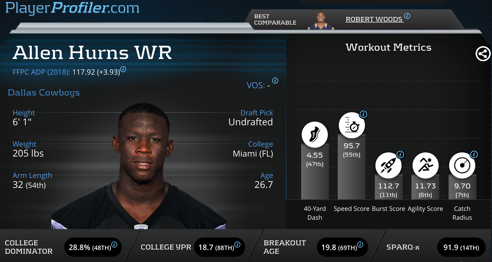 Hurns is currently being drafted in the late ninth or early 10th round. Hurns is a value at this spot because he will become the target leader for the Cowboys and possibly their best receiving red zone threat.