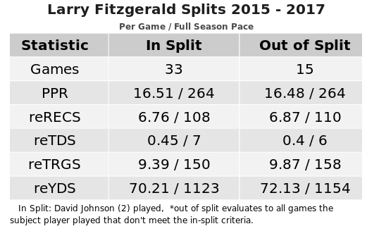 The second narrative depressing the value of Larry Fitzgerald’s WR1 reality is the return of David Johnson. Johnson is a target hog, drawing 120 targets in his only complete season. He will touch the ball frequently. Fitzgerald’s role, however, will not fade away. If anything Johnson’s presence improves the overall efficiency of this offense, and that is not bad for Fitzgerald. With Johnson on the field in 2016, the Cardinals were able to run about 30 more pass plays and scored seven more passing touchdowns.