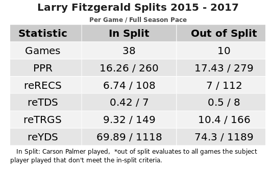 The second narrative depressing the value of Larry Fitzgerald’s WR1 reality is the return of David Johnson. Johnson is a target hog, drawing 120 targets in his only complete season. He will touch the ball frequently. Fitzgerald’s role, however, will not fade away. If anything Johnson’s presence improves the overall efficiency of this offense, and that is not bad for Fitzgerald. With Johnson on the field in 2016, the Cardinals were able to run about 30 more pass plays and scored seven more passing touchdowns.
