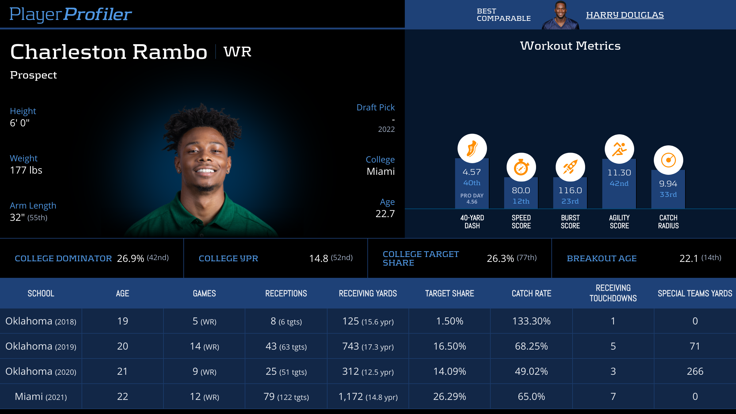 UDFA Watch: Charleston Rambo– WR- Miami(FL)- Rambo was a freshman at OU when CeeDee Lamb and Malcolm Brown dominated the receiver room, and Rambo transferred to Miami where he finished 2021 with the school record for receptions and receiving yards. He could be presented with an opportunity to take the slot role if Terrace Marshall continues to struggle to find the field.