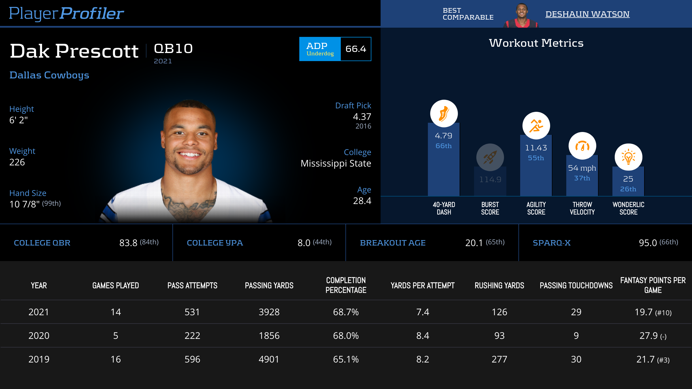 On the heels of a straight-up embarrassing romp of the Washington Football Team, Dak Prescott and the Cowboys host the Cardinals. After a string of subpar outings, Prescott broke out in a big way for his best game of the season (330 Passing Yards and 4 Passing Touchdowns for 34.3 DKPt). Although everyone certainly will want a piece of this offense after watching the prime-time blowout of the WFT, his ownership will naturally shrink based on the sheer number of games (14) on the slate.