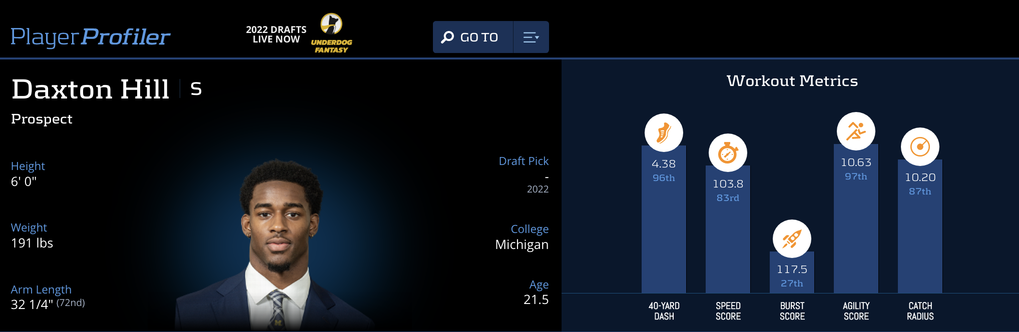 Another top prospect from the 2019 recruiting class, this time from Michigan. Daxton Hill is a burner, eclipsing 4.40 in the 40-yard dash and finishing with a 97th-percentile Agility Score. Hill finished with 149 tackles, and 15 pass breakups over the last three seasons. The Vikings lost Xavier Woods at safety, who played 17 games next to Harrison Smith in 2021. Woods was let go this spring and signed with Carolina. With the versatility that he brings, playing anywhere from free safety to nickel corner (where Minnesota has struggled the last few seasons), Hill has the ability to cover big tight ends in-line. But his lack of strength and true size throughout does hinder him.