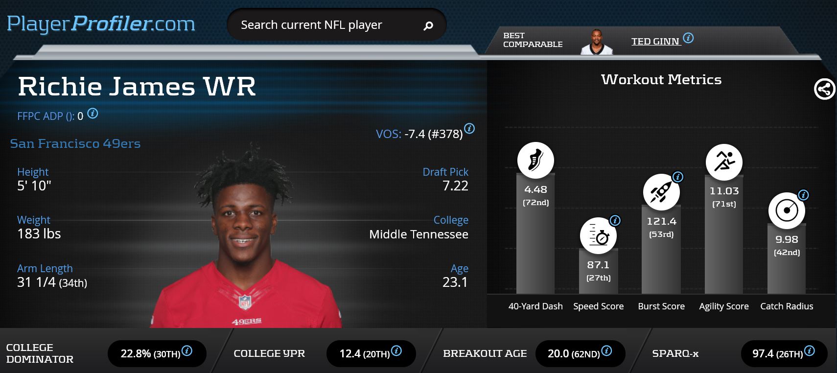 With one catch for seven yards on the season, Richie James won’t be on many fantasy radars. With a 22.8-percent (30th-percentile) College Dominator Rating and a 97.4 (26th-percentile) SPARQ-x score, he’s not the kind of player the Underworld faithful tend to gravitate towards. In this particular case, the team he plays for doesn’t matter as much as his projected Opportunity Share. With most of the projected opportunity coming from the slot, he has a chance to use his upper-percentile agility to make red zone plays should the team receive sufficient chances. Given the up-and-down nature of this team’s receiving group to this point in the year, he’s well worth the stash.