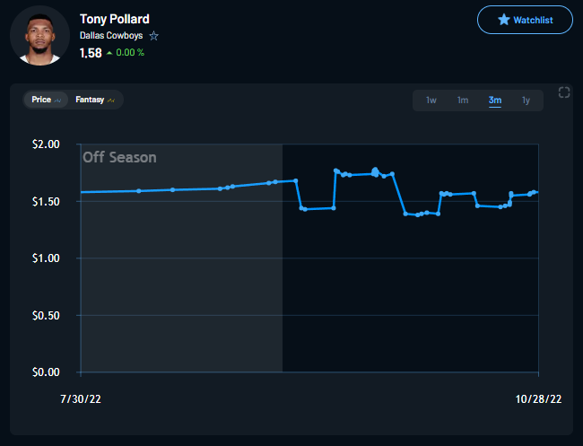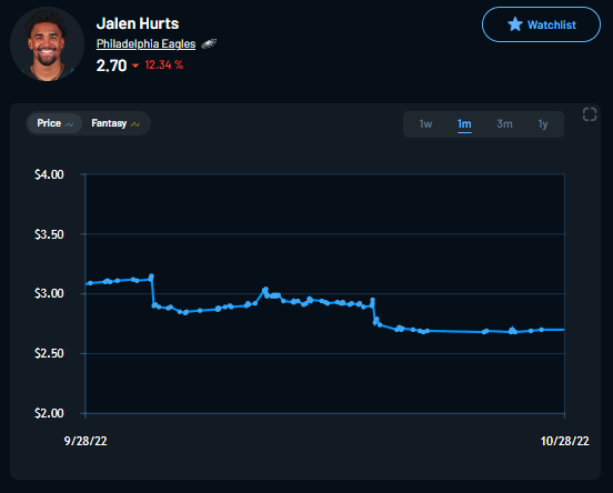 Hurts’ projection is set at 22.49 points on Prediction Strike. He’s hit that in four of six games this season, and his price has dipped over 12-percent over the past month. His 2.9-point differential is the second-highest among QBs and he costs less than $3 per share. All signs point to a great buying opportunity for Jalen Hurts.
