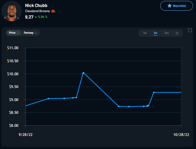 A brief recap of Week 7: Nick Chubb was the big recommendation, and he did not disappoint. He beat his project by 3.66 points and gained 6.2-percent. Unfortunately, the good ends there because both Keenan Allen and Garrett Wilson went down. With Williams out with a high-ankle sprain, I still believe that the Keenan Allen investment will make a profit, but it will take a few weeks. With that out of the way, let’s turn our attention to Week 8!
