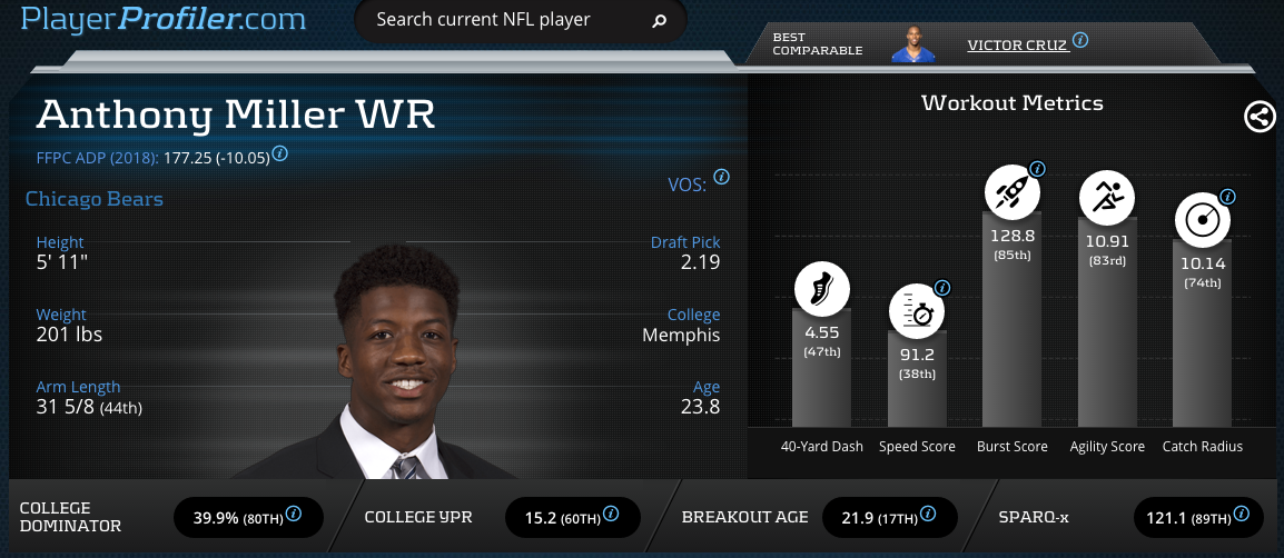 After losing his entire 2017 campaign to a torn ACL, the Bears made Allen Robinson the tenth highest paid receiver in a completely overhauled receiving corps. However, the Bears added additional competition by trading up to draft Anthony Miller in the second round of the NFL Draft. The Bears showed confidence in Anthony Miller out of the gate by trading up to select him. Miller proved to be a quick-footed, route technician at Memphis, with a 128.8 Burst Score (85th-percentile) and a 10.91 Agility Score (83rd-percentile). Second year quarterback, Mitch Trubisky excelled on throws to the middle of the field, recording a 105-passer rating in that zone. Expected to play out of the slot, Miller closely compares to former slot maven Victor Cruz.