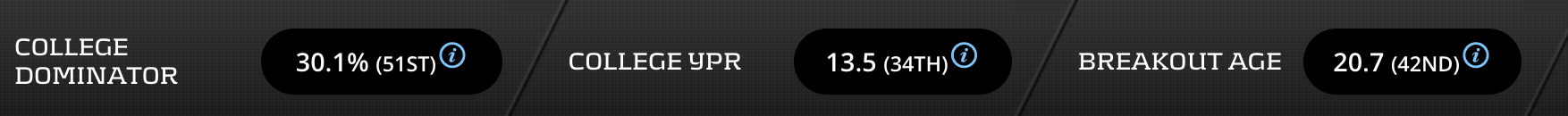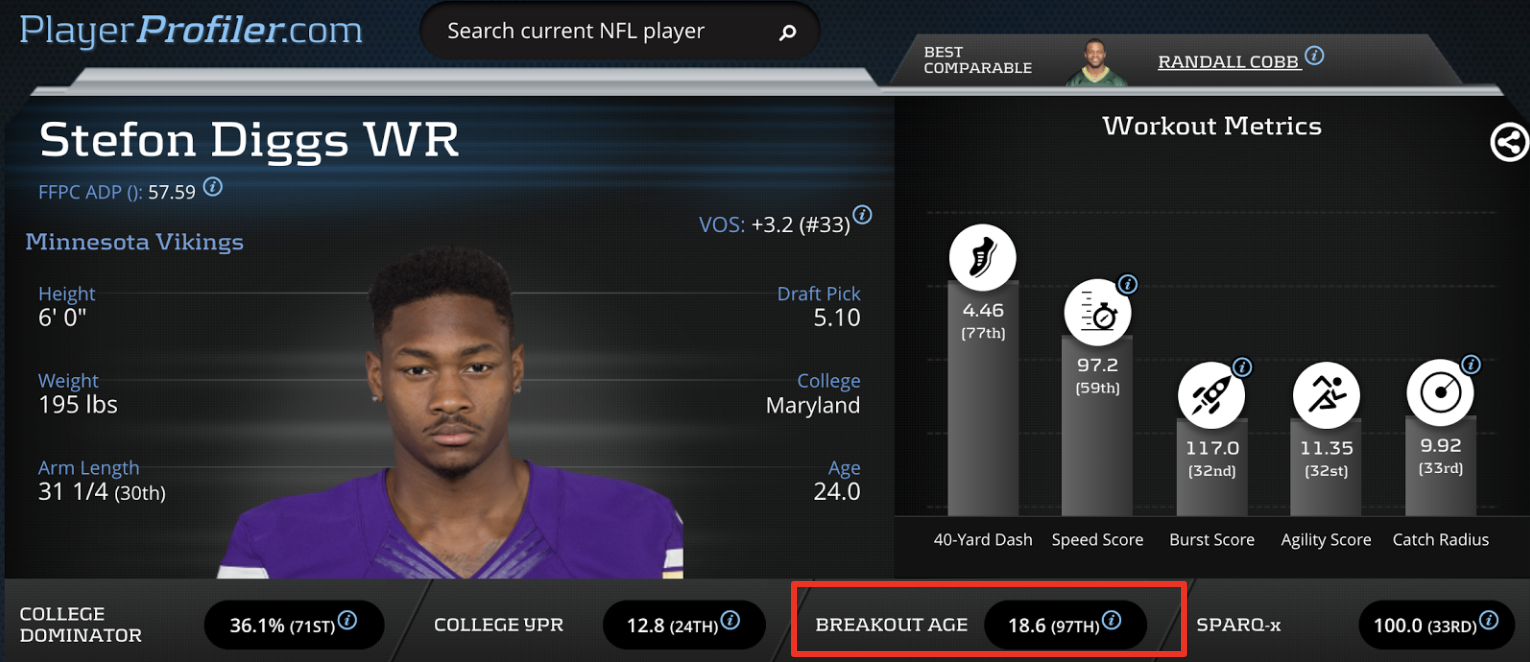 In January 2014, Rotoviz writers Shawn Siegele and Frank DuPont introduced the fantasy football world to the Breakout Age metric. Breakout Age is defined by the first season in which a receiver achieves a 20-percent or higher College Dominator Rating. Analytical analysis suggests earlier Breakout Ages increase the likelihood increases that the player will have a successful NFL career. Breakout Age is one of the most predictive advanced stats and metrics on any wide receiver prospect profile and a critical component of a college receiver talent evaluation.