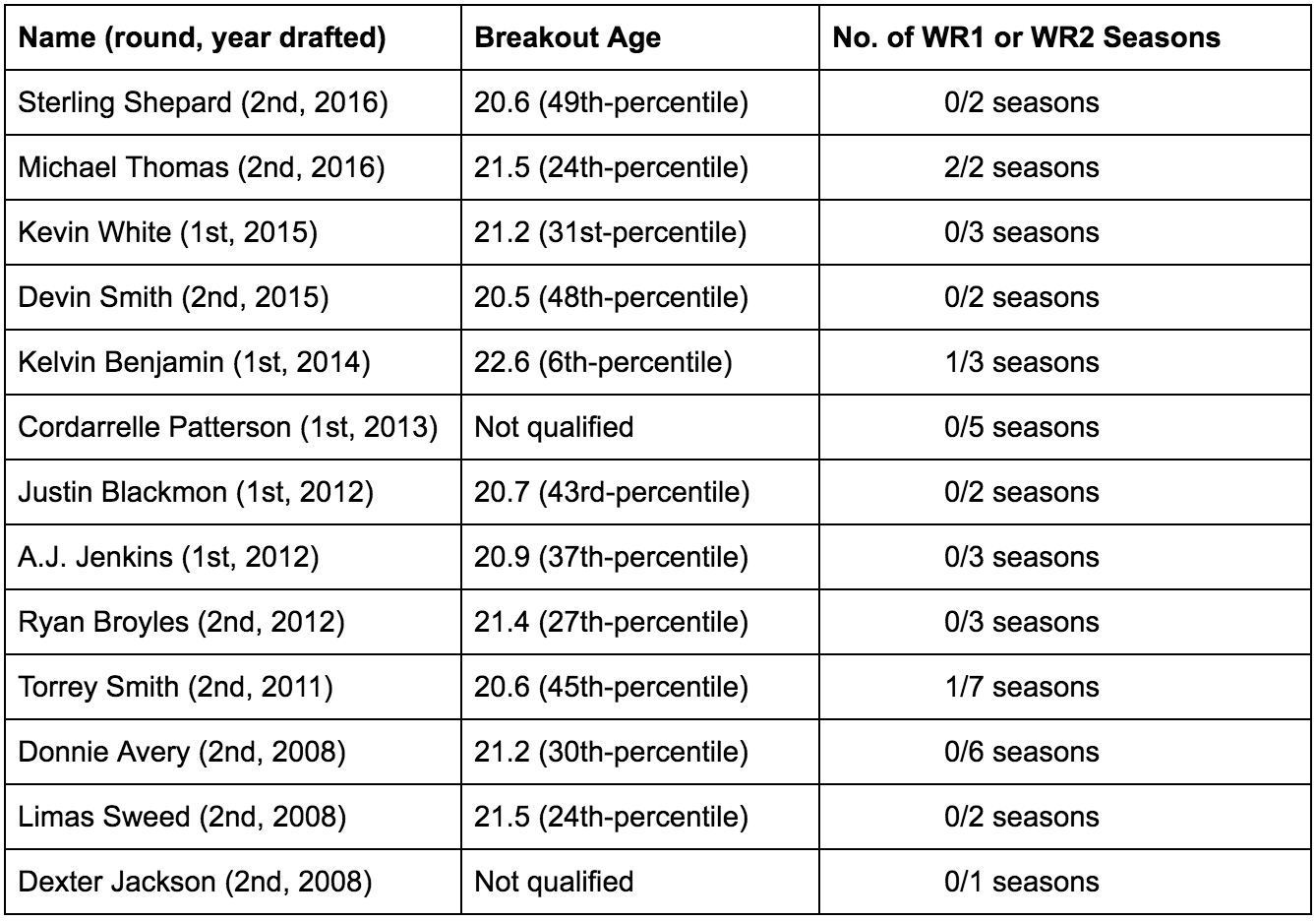 Taking a look at the top 24 wide receivers in 2017, only two had a Breakout Age below the 50th-percentile: Michael Thomas and Tyreek Hill. Between Hill and Thomas, only Thomas was selected within the first two rounds of the 2016 NFL Draft. The Chiefs threw a dart at Hill in the 5th round, and have reaped the benefits thus far. However, most wide receivers drafted within the first two rounds of the NFL Draft with below-average Breakout Ages fare poorly.
