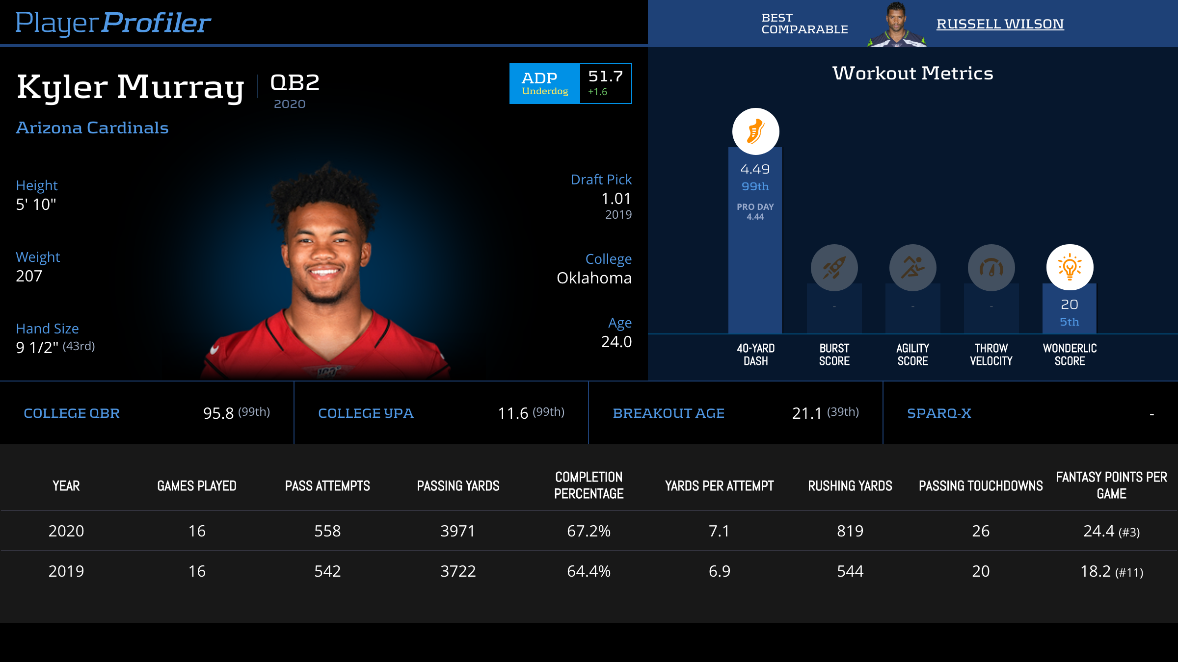 Fact to know: Kyler Murray’s should injury started in Week 9 but became noticeable in Week 11 versus the Seahawks. Before Week 11, Murray never scored less than 24.12 points on DraftKings. Following Week 11, he only had over 20 points one time: Week 15, where he had the third-most touchdowns per attempt (0.08) on the season, and his receivers averaged the highest yards after the catch per reception (7.19). Kyler is a different player when healthy.