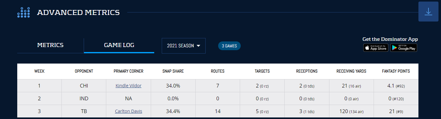 What I Learned: It’s not new, as I was touting it in the Week 3 piece, but it’s more to confirm my suspicions. Attack Ross Cockrell. Sean Murphy-Bunting was bad as I was constantly targeting matchups against him in the slot. Cockrell is far worse.