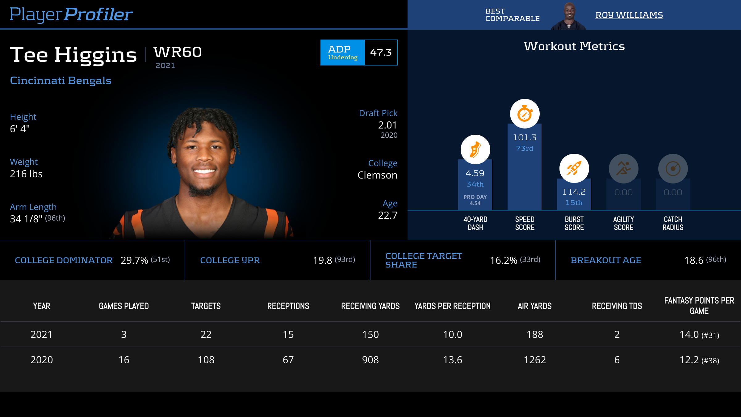 The Bengals are starting to throw more with Joe Burrow regaining confidence in his knee. This is always good news for pass catchers, especially one like Higgins who has a 95.8-percent (No. 12) Route Participation. His 23.9-percent (No. 24) Target Share is also promising. He has an alpha profile, and faces off against Detroit next week. The former Clemson Tiger is in a great position to rebound soon.