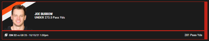 Overtime and missed field goals killed this pick. It was great to see Joe Burrow with less than 273.5 passing yards in regulation, but a missed field goal from both Mason Crosby and Evan McPherson sent this game to OT, shooting me down from cloud nine.