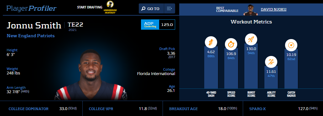 While Smith’s 54.8-percent (No. 34) Snap Share and 12.3-percent (No. 21) Target Share (No. 21) underwhelm, his 35.9-percent (No. 1) Target Rate is impressive. Essentially, he receives about one target for every three routes run. Add in the fact that he has some of the most explosive workout metrics for a TE, and the result is a low-risk correlation pick for a player that can turn a little into a lot.