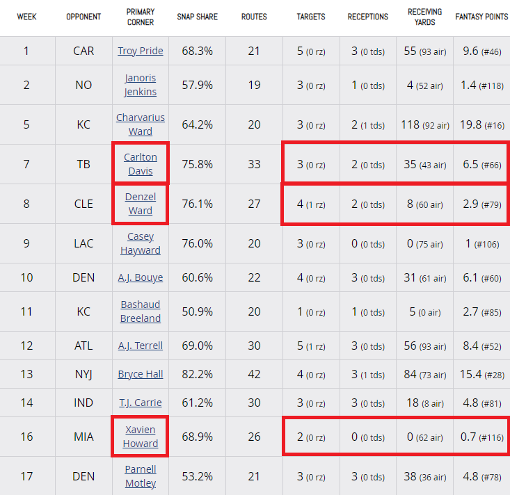 Henry Ruggs faced three top-15 cornerbacks last season. His total stats in those games were four receptions (nine targets) for 43 yards and zero touchdowns. Good luck facing Humphrey. Bryan Edwards had success (on a small scale) against talented cornerbacks. Ultimately it won’t matter unless his 6.2-percent Hog Rate and 12.0-percent Target Rate increase.