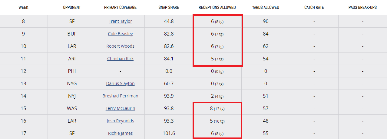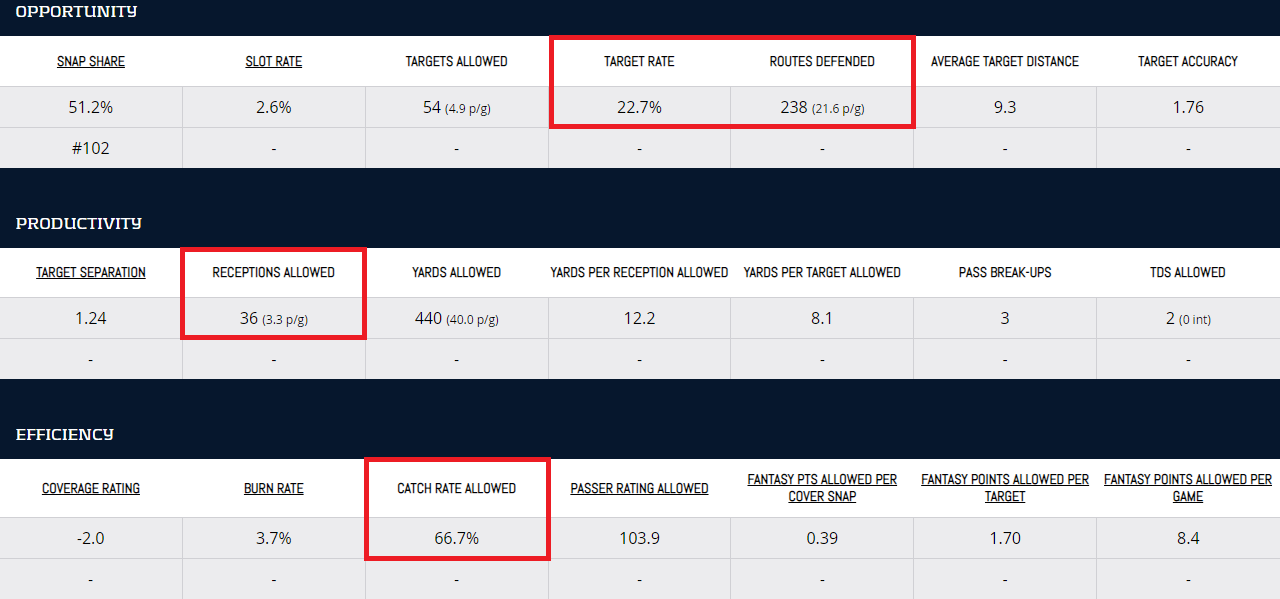 He saw a 22.7-percent Target Rate and allowed a catch on 15.1-percent of his Routes Defended. If he had enough snaps to qualify, both would have finished in the top-10 highest rates. This tells us that opposing offenses targeted Maddox often with success.