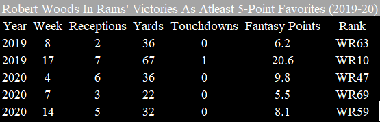 Over the past two seasons, the Rams have been at least a 5-point favorite at home against their opponents nine times. Woods missed one of those games. In those eight games, the Rams won five times. He failed to top 70 receiving yards in any of those games. When the Rams take care of teams they are supposed to beat, Woods isn’t utilized because he isn’t needed.