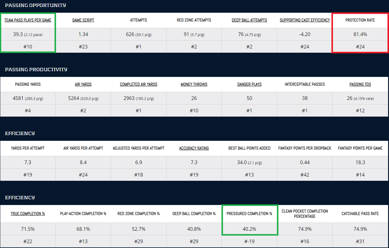 QB Pressure Rate in 2020 via Pro-Football-Reference