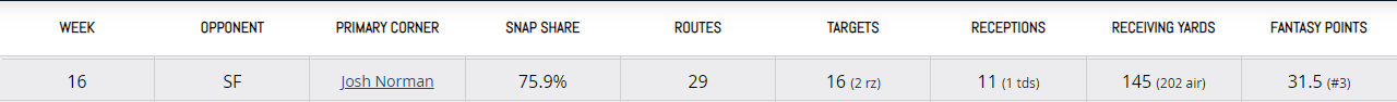 We have ourselves a nasty three-way split in the backfield. There have been games earlier in the year where Myles Gaskin carried the load and finished as a top 12 fantasy running back four times this year. Duke Johnson rewarded his loyal truthers with an overall RB1 scoring performance in Week 15 against the Jets. Phillip Lindsay was out with an injury, but came back in Week 16 and received more snaps than all other running backs on the team. So moving forward, we can’t play any of these running backs with any confidence. There is a scenario where we see a RB2 performance emerge from the rubble of this backfield, but I’d rather enjoy watching the star receiver on the offense.