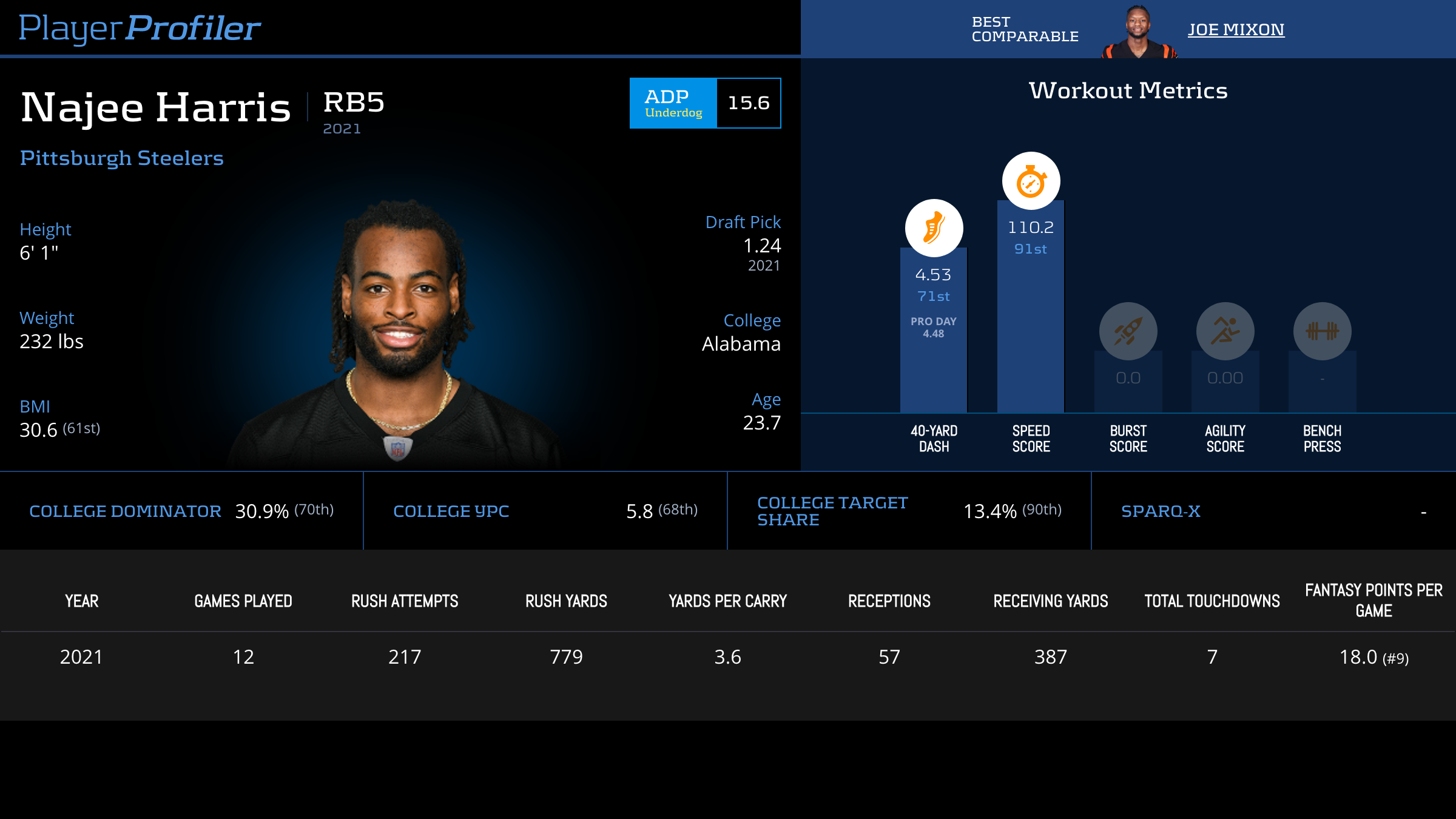 Najee Harris is an inefficient workhorse who has been propped up by his 19.83 (No. 2) Weighted Opportunities per Game and 15.5-percent (No. 4) Target Share. He comes in with a disappointing 26.6-percent (No. 29) Juke Rate and 3.7 (No. 59) True Yards per Carry. Still, given his opportunity he has the floor of a high end RB2.