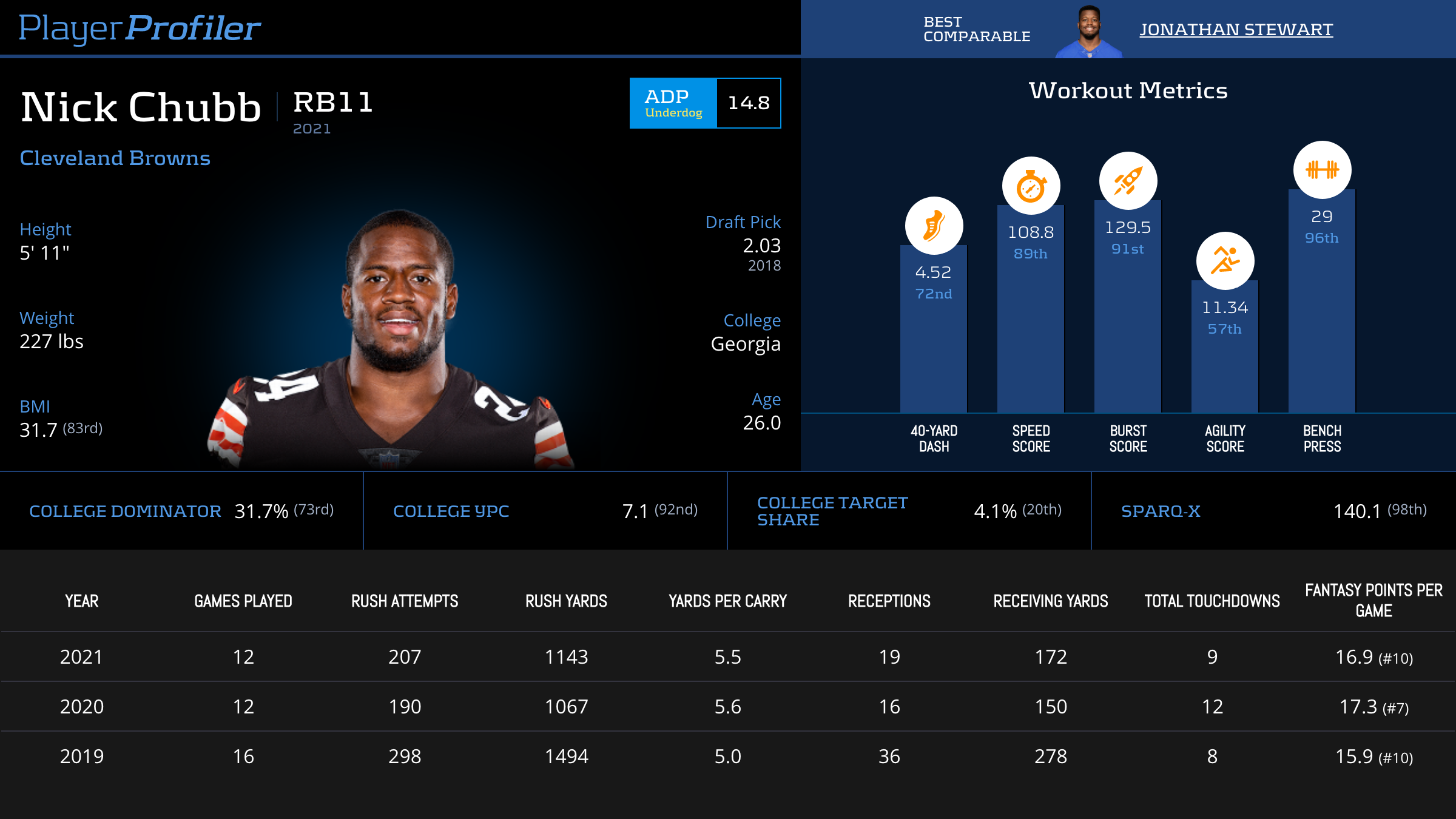 Nick Chubb is trying his best to bring his managers a title, scoring 16.3 and 27.4 fantasy points over the last two weeks. The elite playmaker has yet again shown phenomenal efficiency, cracking a 35-percent Juke Rate and 5 True Yards per Carry for the second straight season. He is a lock for a big week against a struggling Steelers rush defense.