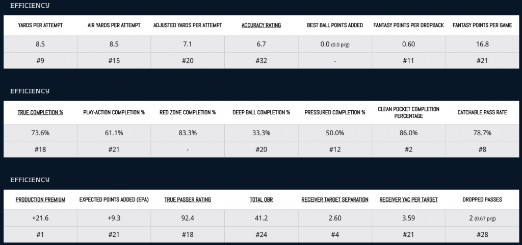 Joe Burrow is playing better than people are giving him credit for. He’s been accurate and efficient, posting a 73.6-percent (No. 18 among qualified quarterbacks) True Completion Percentage, 50-percent (No. 12) Pressured Completion Percentage, and 7 (No. 3) Money Throws. His offensive line has surprisingly protected him well, with an 84.5-percent (No. 12) Protection Rate. Burrow’s problem is that his ceiling is capped because he’s passing at a much lower rate than expected, throwing 25 attempts per game so far. He appears to be a promising play this week against a porous Jags defense, but the projected Game Script and short week doesn’t bode well for his ceiling.