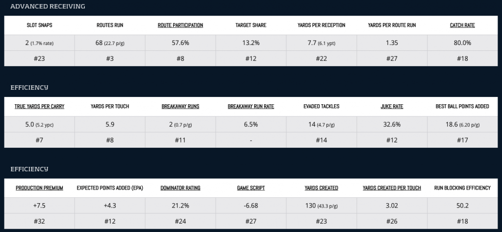 James Robinson had his resurgence last week. Urban Meyer finally figured out that JRob is better in the passing game. Robinson has received 42.2 (No. 12) Weighted Opportunities with a 57.6-percent (No. 8) Route Participation, two stats you love to see for an RB in fantasy. On a per-touch basis, Robinson has been pleasantly efficient. He’s a low-floor/high-ceiling flex play in PPR formats.